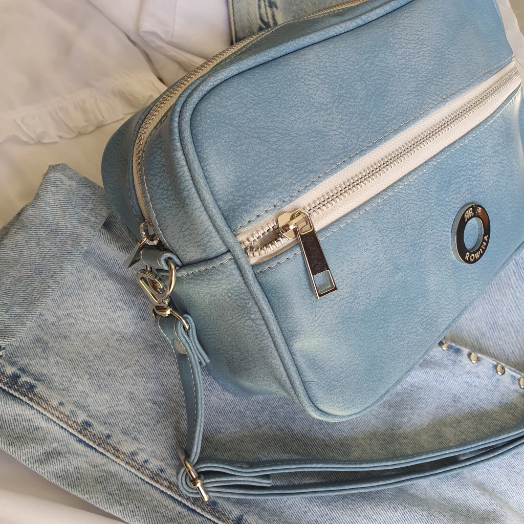 - Confeccionada en Cuero Sintético color celeste simil jeans.