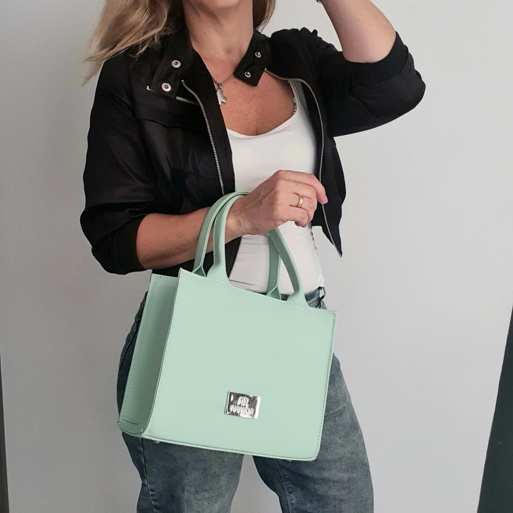 - Cartera estilo rígido, confeccionada en cuero sintético color verde menta