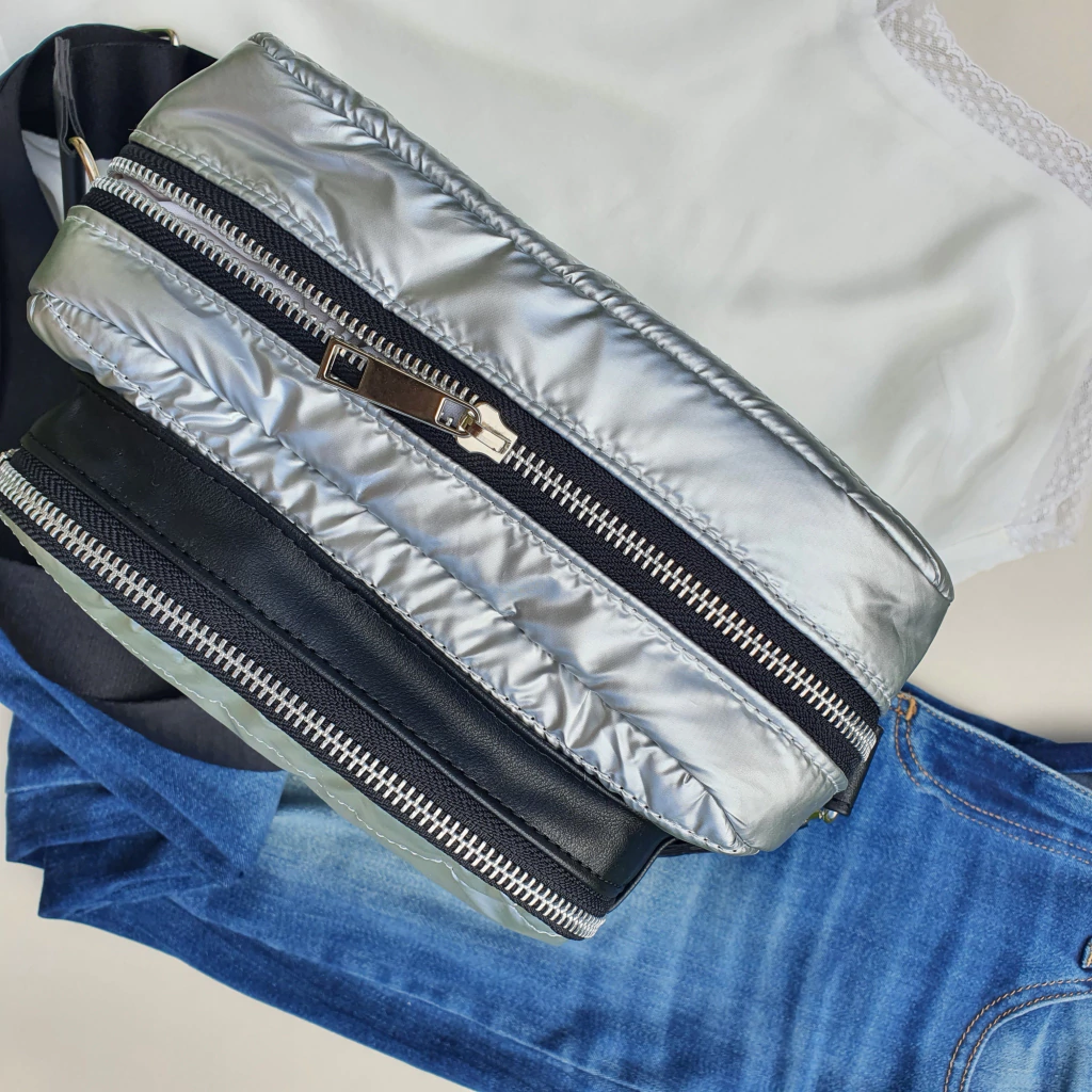 Confeccionado en tela Puffer Plateada con detalles en cuero ecológico.