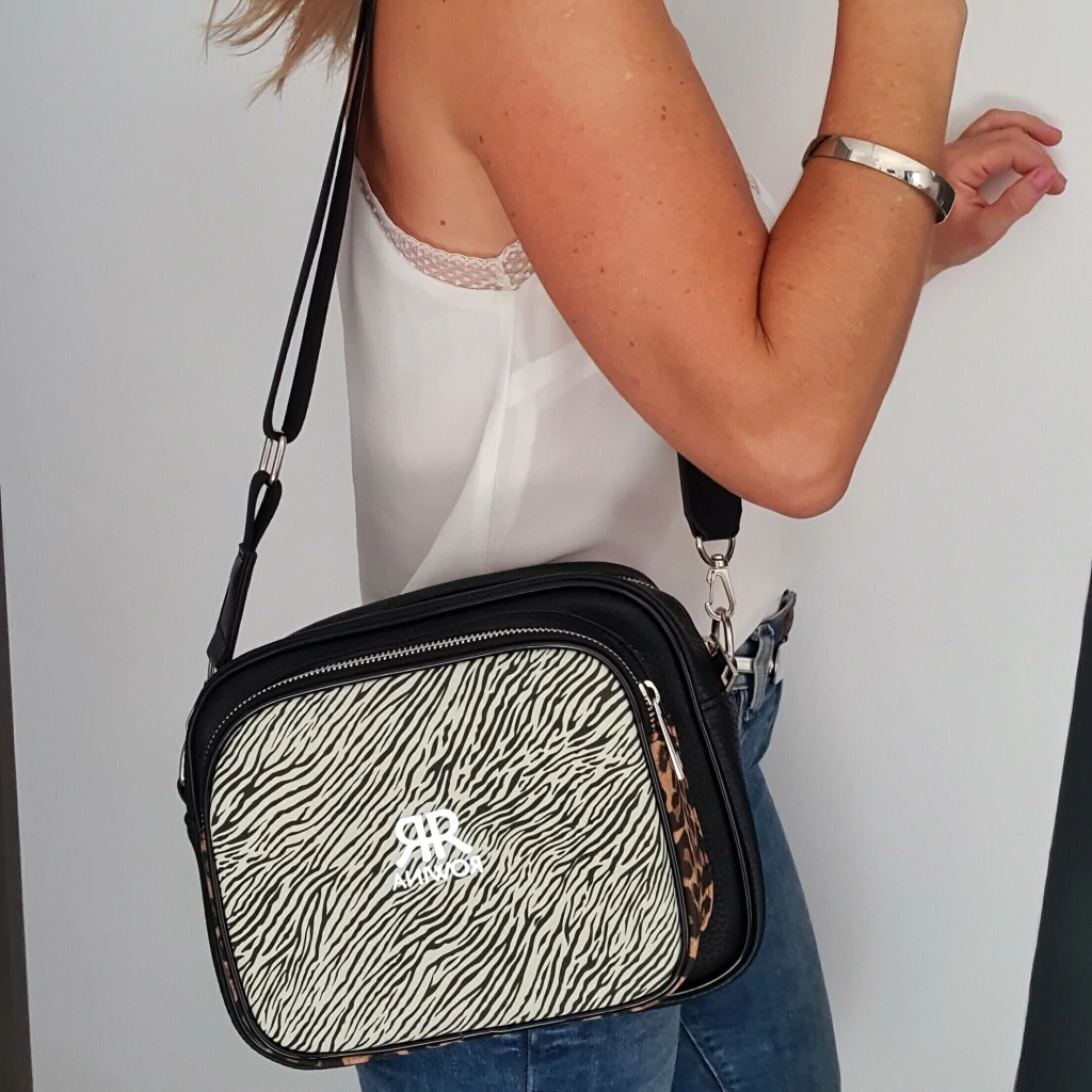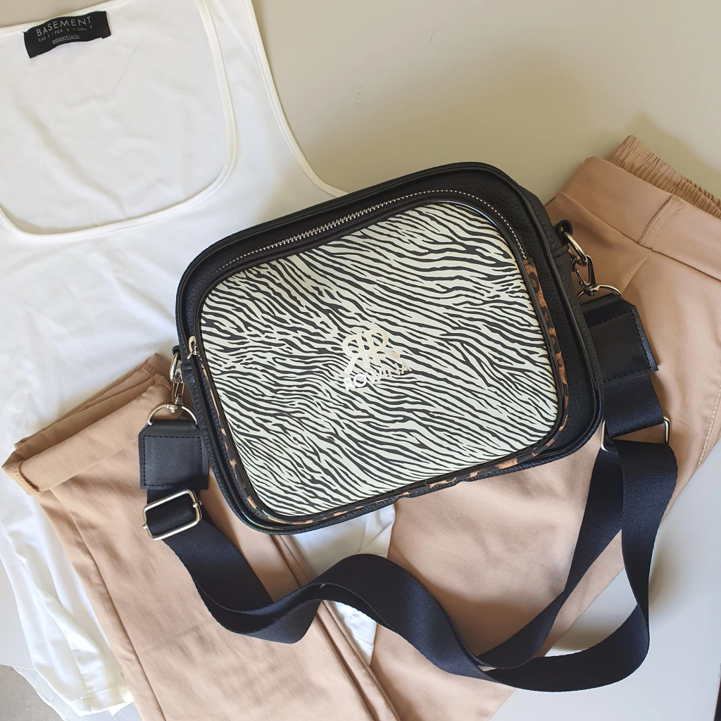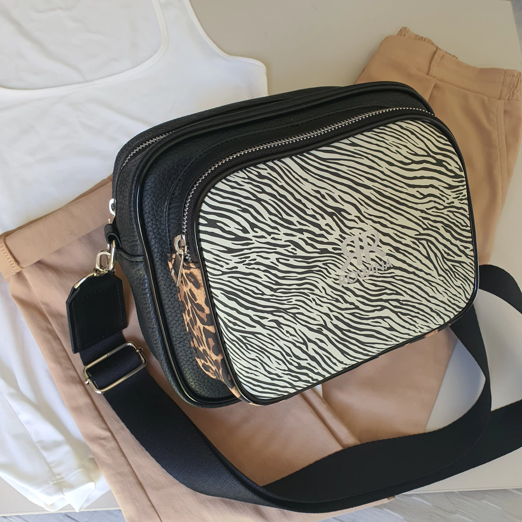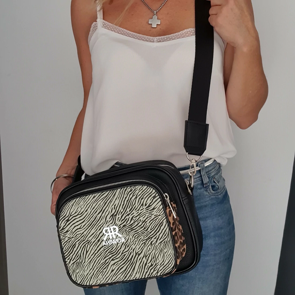 Confeccionado en cuero ecológico color negro con detalles en animal print, bolsillo frontal pu cebra.