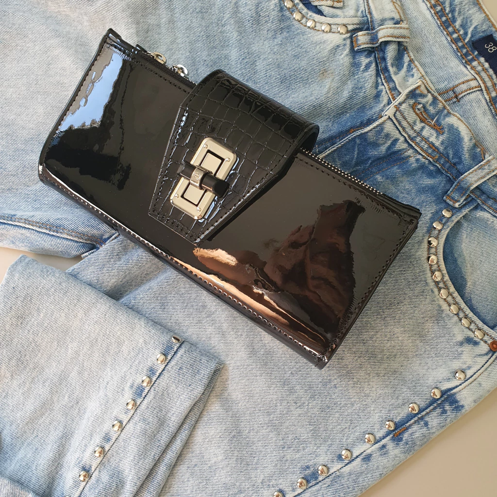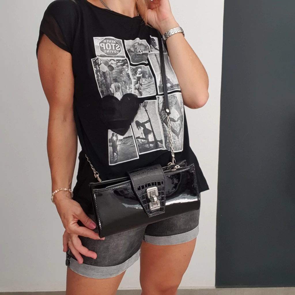 Confeccionada en Cuero Ecológico PU negro charol y solapa charol crocco.