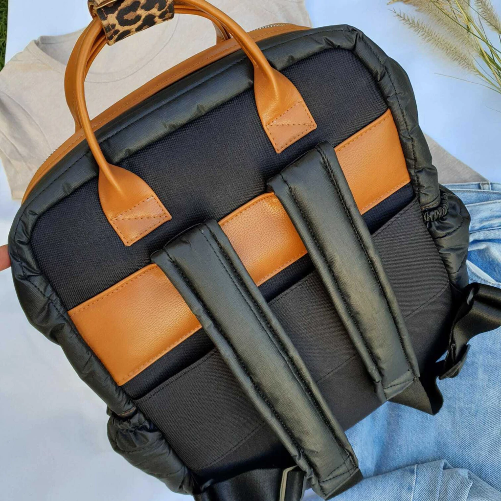 Confeccionada en tela puffer color negro opaco y detalles en cuero sintético a contra tono color suela. bolsillo frontal amplio, y 2 bolsillos laterales