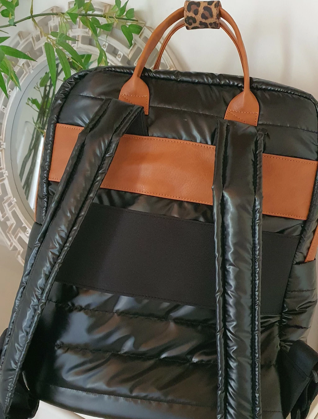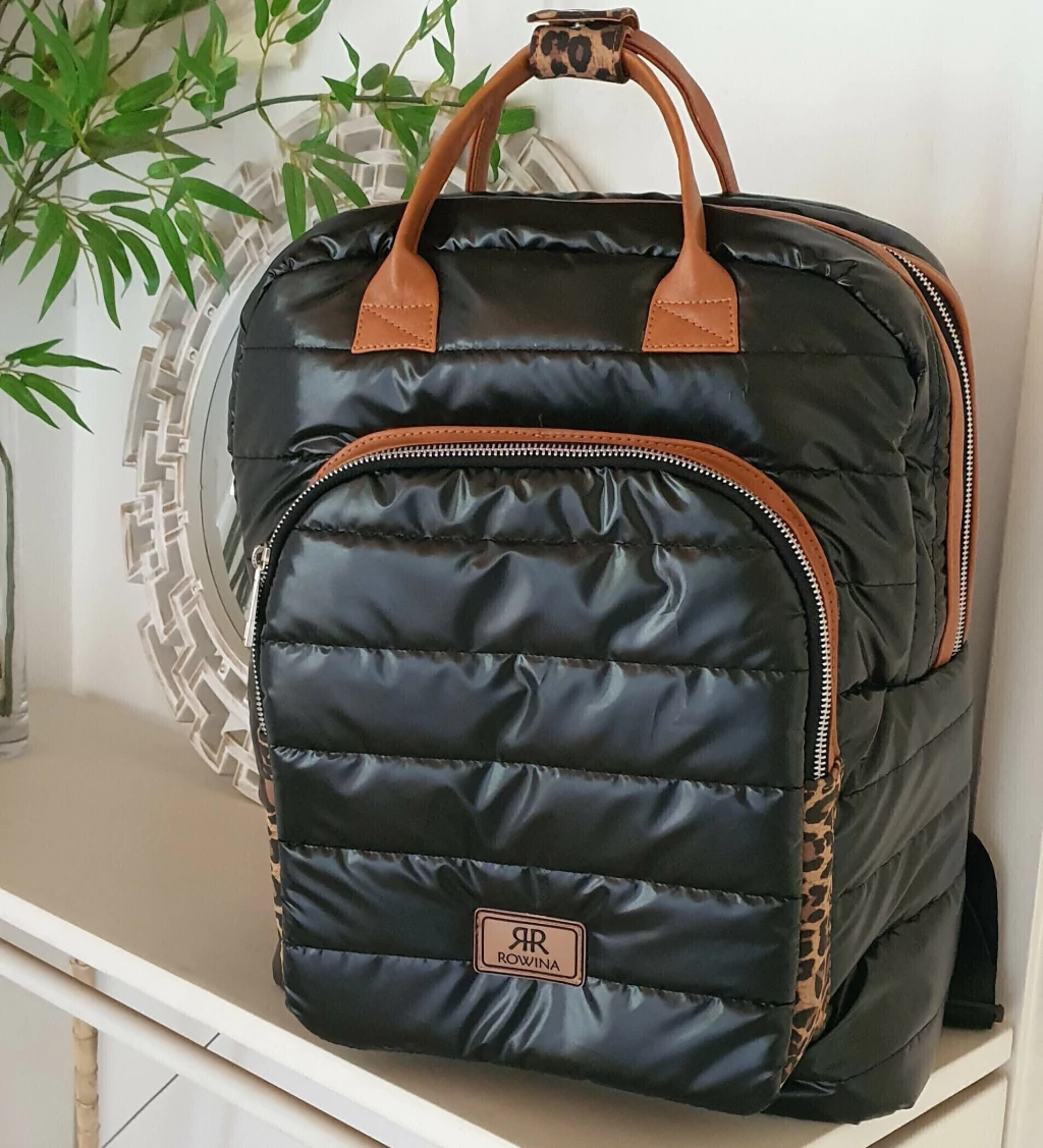 - Confeccionada en tela puffer negra y detalles en cuero sintético a contra tono color suela y animal print. Bolsillo frontal amplio.