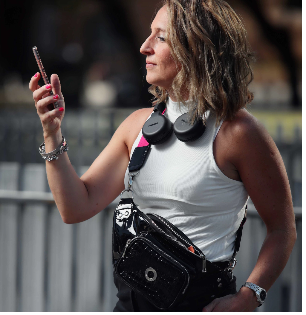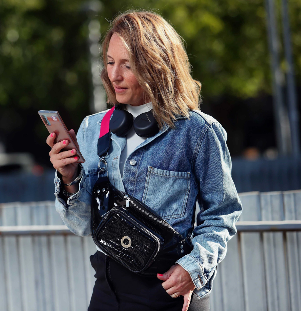 - Confeccionado en cuero ecológico color negro charolado, bolsillo frontal